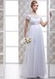 Легкое свадебное платье из шифона зрительно вытягивает силуэт за счёт завышенной талии. Наряд отлично подходит для беременных невест. Кружевная вставка на груди и миниатюрные рукавчики придают образу нежность и романтичность. Талия украшена вышивкой ручной работы. Длинная юбка свободного кроя струится до самого пола.