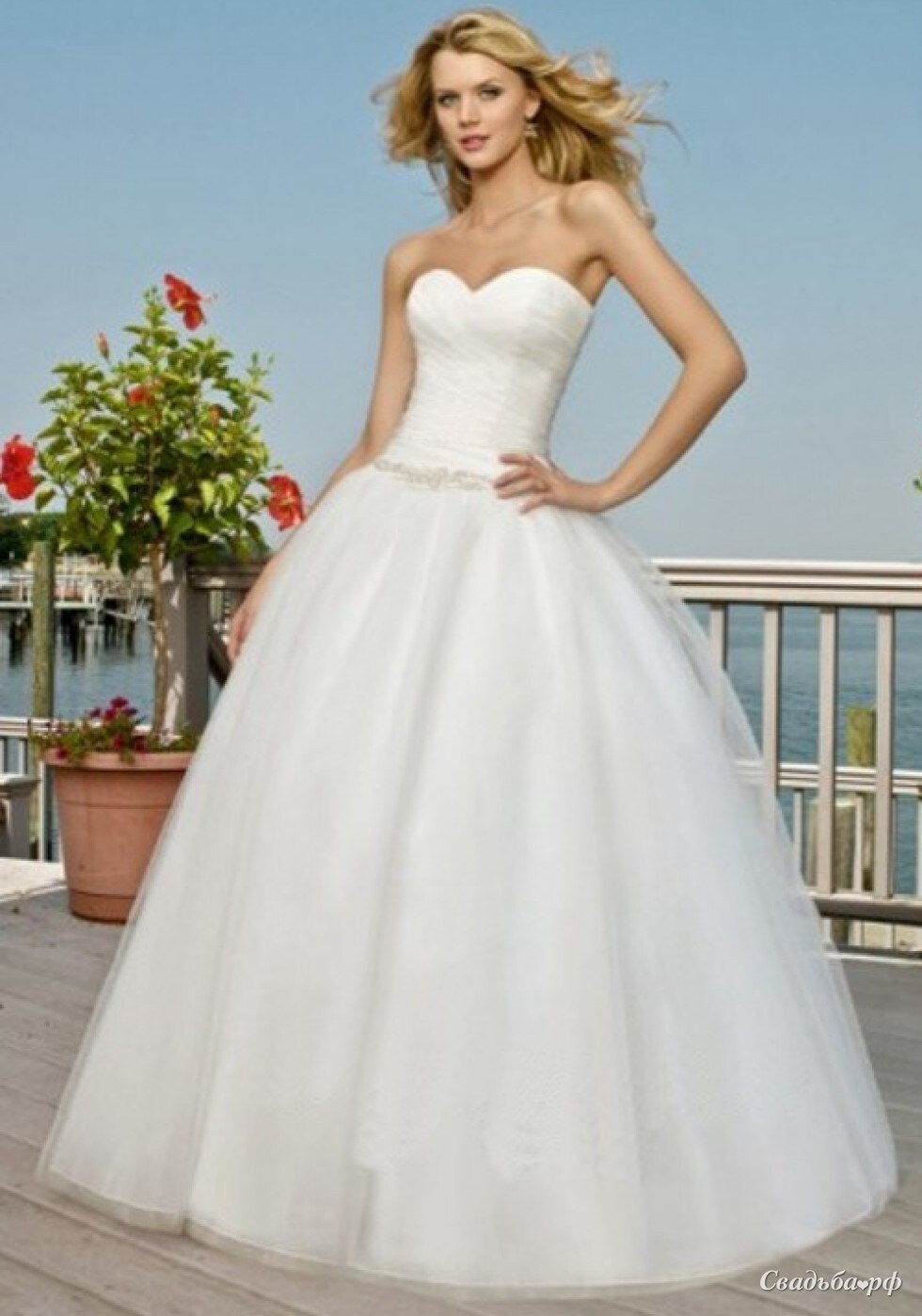 Пышное свадебное платье с заниженной талией. Корсет с V-образным вырезом украшен перекрестной драпировкой, что подчеркнет тонкость вашей талии. Низ корсета отделан пояском, вышитым бисером и стразами. Пышность юбки можно регулировать нижними юбками с кольцами.
