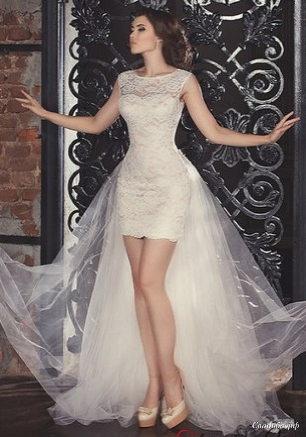 Короткое платье из кружева, шлейф на платье съемный.