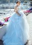 Платье голубого цвета с пышной юбкой с воланами, корсет на шнуровке, рукава ¾ из сетки телесного цвета.