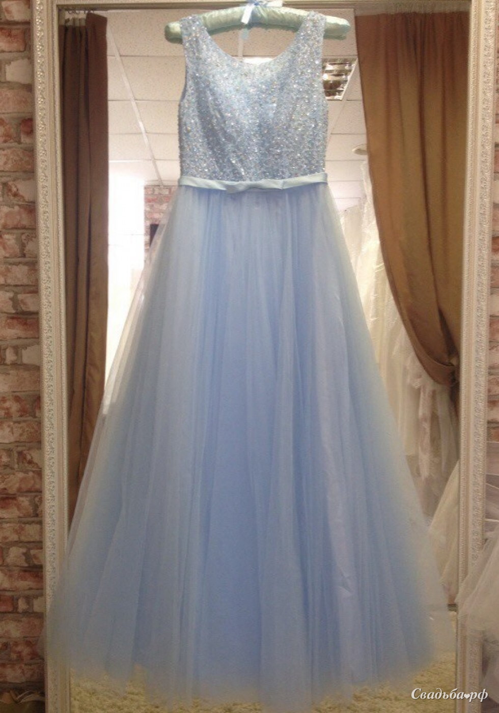 Длинное платье в нежно-голубом цвете из фатина и кружева, корсет украшен стразами