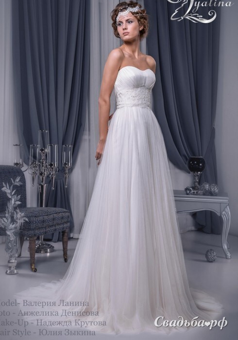 Свадебное платье Лайма из коллекции Рассыпающая Звезды... дизайнера Svetlana Lyalina не перегружено лишним декором. Миниатюрный корсет с открытой зоной декольте и широким поясом привлекает внимание к бюсту и подчёркивает талию. Длинная юбка из полупрозрачной ткани струится до пола и переходит в шлейф. Лёгкий наряд для обворожительной невесты.
