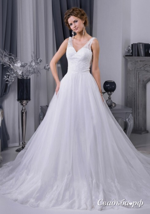 Свадебное платье Марсия из коллекции Рассыпающая Звезды... дизайнера Svetlana Lyalina смотрится нежно и женственно. Изящные претели из полупрозрачной ткани обрамляют глубокий V-образный вырез на груди. Спинка кокетливо открыта. Корсет украшен тонким узором. Пышная юбка придаёт образу воздушность. Наряд дополнен роскошным шлейфом.
