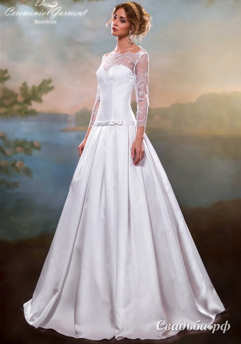 Свадебное платье Альба из коллекции SL Cremonial Garment Barcelona дизайнера Svetlana Lyalina понравится стильным и женственным красавицам. Полупрозрачная вставка на груди и длинные рукава из такой же ткани помогут создать целомудренный образ. Заниженная талия подчёркнута поясом и бантиком. Длинная юбка с широкими складками доходит до пола.