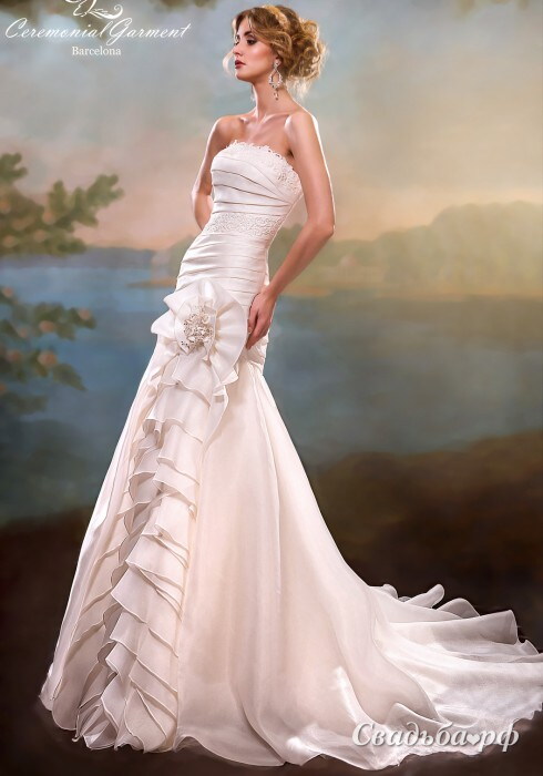 Свадебное платье Майли из коллекции SL Cremonial Garment Barcelona дизайнера Svetlana Lyalina создано для самых эффектных красавиц. Заниженный корсет с плотной драпировкой подчёркивает достоинства фигуры. Длинная юбка с многоярусными воланами и крупным бантом на бедре дополнена гладким верхним слоем. Шлейф придаёт образу особый шик.