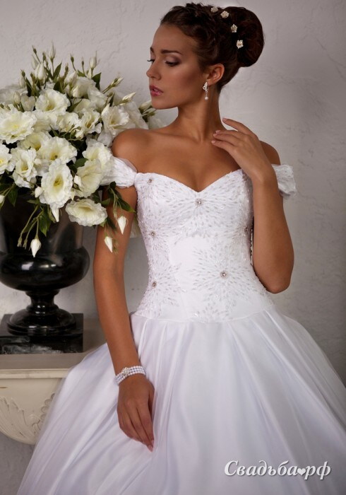 Модель Noelle представлена в свадебном салоне Belle Amore, цена по акции 26 500 руб. Это свадебное платье с роскошным корсетом и пикантно приспущенными плечиками выполнено из элитных тканей и вручную декорировано. Пышная юбка с оригинальной многоярусной вставкой сзади смотрится эффектно и неповторимо. Наряд подчеркнёт достоинства Вашей фигуры.
