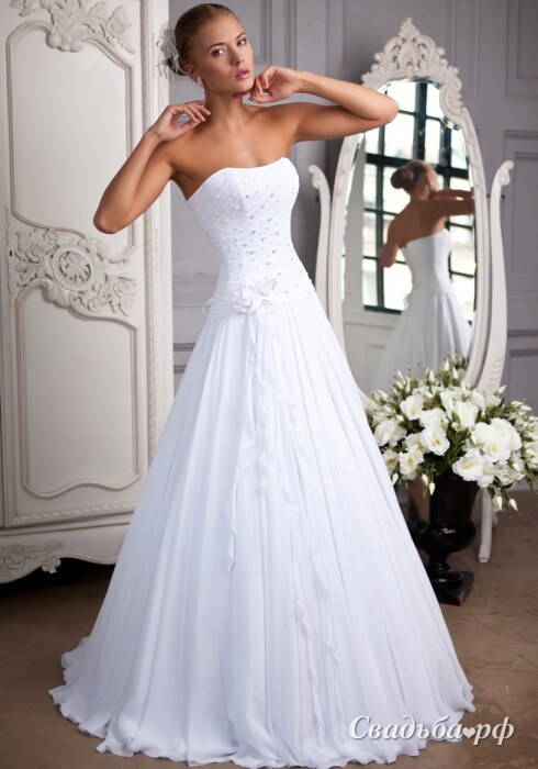 Модель Gesedeya представлена в свадебном салоне Belle Amore, цена по акции 26000 руб. Лаконичное и лёгкое свадебное платье с открытой зоной декольте выполнено из мультишифона и благородного атласа. Корсет расшит вручную. Длинная юбка с нежными складками струится до самого пола. На бедре уютно разместился объёмный цветок.