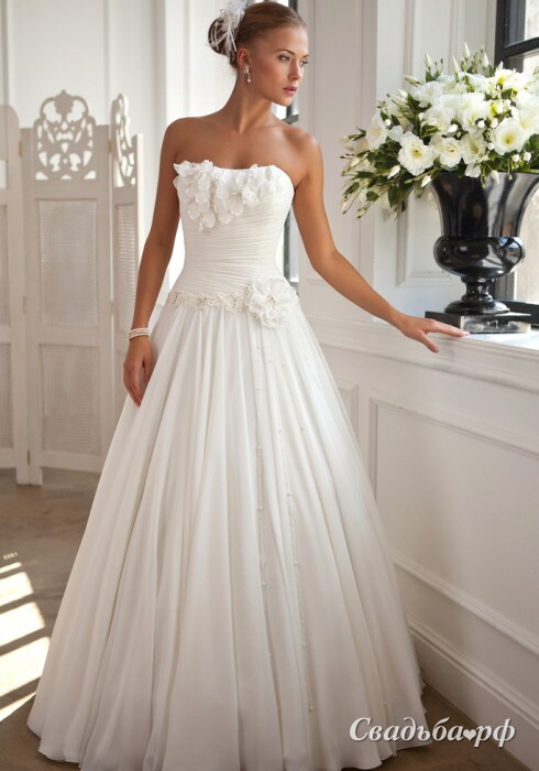 Модель Milana представлена в свадебном салоне Belle Amore, цена по акции 26000 рублей. Такое свадебное платье понравится романтичным и чувственным натурам. Драпированный корсет с открытой зоной декольте по верхнему краю украшен объёмными лепестками. На талии также устроился цветок ручной работы. Пышная юбка со складками струится до пола.