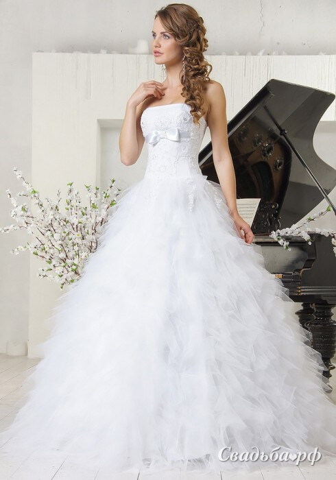 Модель Kristel представлена в свадебном салоне Belle Amore, цена по акции 38000 рублей. Королевское свадебное платье с оригинальной юбкой украшено многоярусными воланами из тонкой ткани. Вручную расшитый миниатюрный корсет с удобной шнуровкой и кокетливым бантиком под грудью зрительно увеличивает бюст и подчёркивает талию.