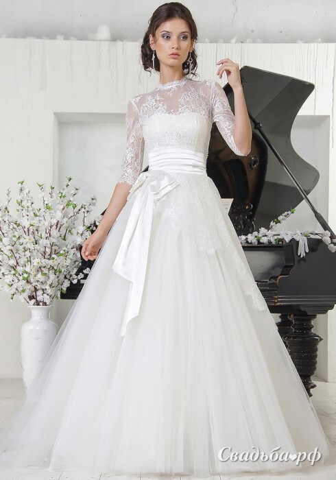Модель Samanta представлена в свадебном салоне Belle Amore, цена платья по акции 24000 рублей. Съёмное кружевное болеро из тонкого кружева стоит 3800 рублей. Талия эффектно подчёркнута широким поясом с крупным бантом. Пышная юбка из воздушной ткани расширяется к полу. Наряд поможет создать безукоризненный образ романтичной невесты. Стоимость болеро 4200 руб.