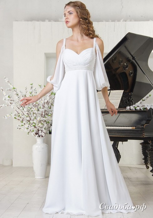 Модель Eva представлена в свадебном салоне Belle Amore, цена по акции 12000 рублей. Романтическое свадебное платье с открытой зоной декольте и оригинальными рукавами выполнено в стиле ампир. Пояс и тонкие бретели вручную расшиты бисером. Модель подчёркивает бюст и зрительно вытягивает фигуру. Длинная юбка струится до пола.