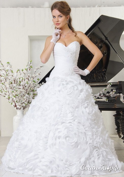 Модель Allure представлена в свадебном салоне Belle Amore, цена по акции 45 000 рублей. Эффектное свадебное платье с открытой зоной декольте и оригинальной юбкой поможет создать сногсшибательный образ. Заниженный корсет с тонкой драпировкой и объёмной вышивкой гармонично сочетается с пышной юбочкой, буквально усыпанной крупными розами.