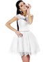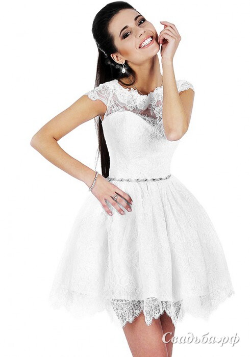 Короткое кружевное платье Barbara представлено в свадебном салоне Belle Amore. Цена по акции 12000 рублей. Полупрозрачная вставка на груди и миниатюрные рукавчики помогут создать невинный образ невесты. Пышная юбочка с ажурной окантовкой доходит до середины бедра. Талия подчёркнута тонким поясом. Покорите всех красотой своих ножек!