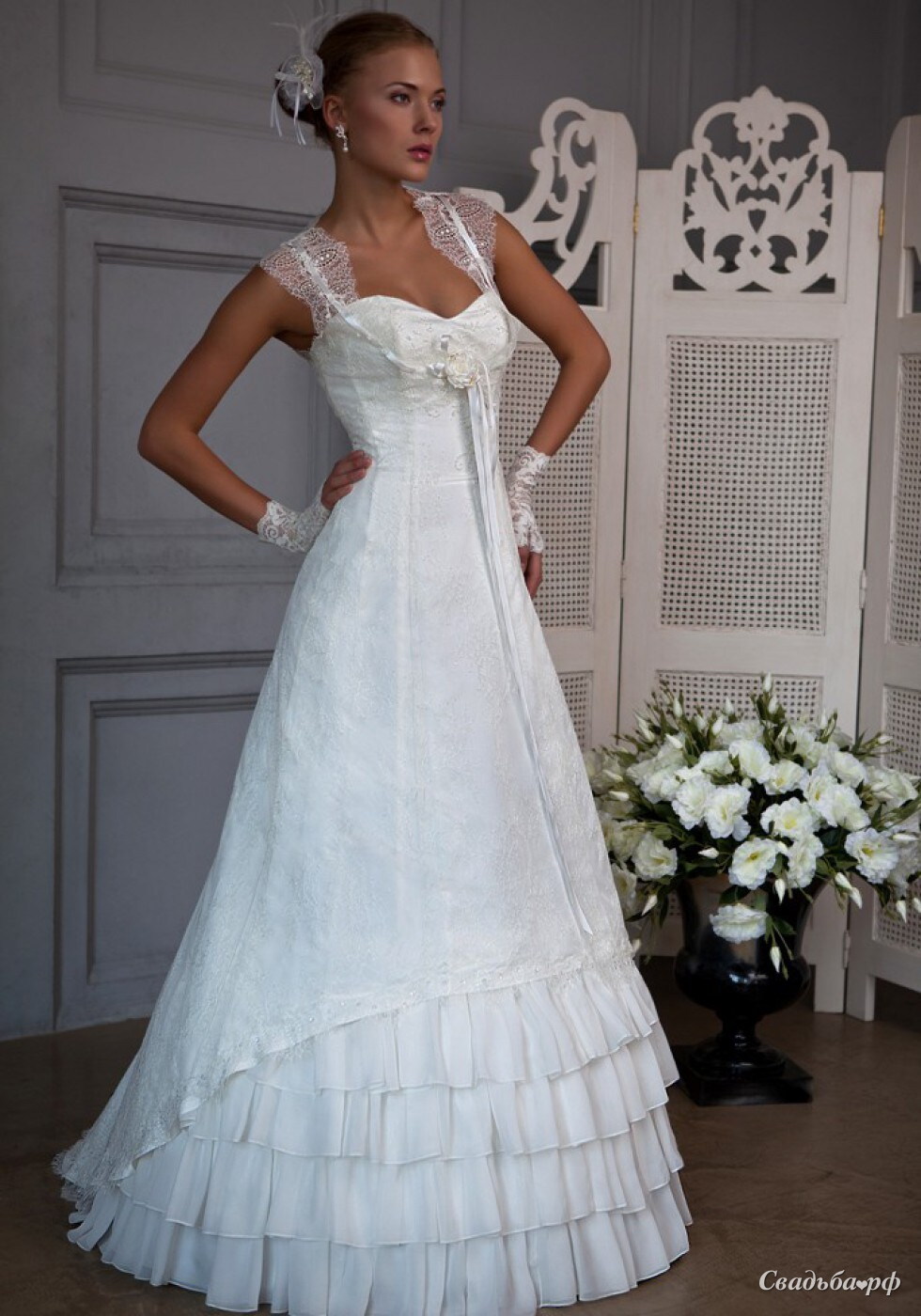 Невероятно стильное, элегатное, классическое свадебное платье. Тончайшее кружево шантильи по всей длине платья делает его очень нежным и утонченным. Лиф расшит вручную жемчугом, бисером, кристаллами и пайетками. Низ платья декорирован также. Множество мягких воланов по низу платья делают его легким и воздушным.