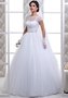 Платье выполнено из тончайшего кружева шантильи и фатина с акцентом на талии в виде расшитого бисером и бусинами пояса. Строгий корсет фиксируется на плечах тонкими бретелями. Изысканное кружево полностью покрывает верхнюю часть платья, а также формирует вырез-лодочку и короткий рукавчик. Пышная фатиновая юбка делает образ по-королевски роскошным.