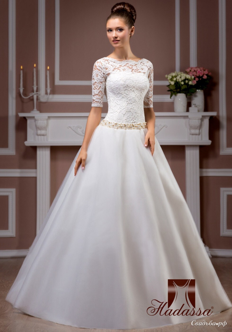 Невероятно красивое платье, украшенное гипюром. Корсет оригинально задекорирован драпировкой. Это не только добавляет платью изысканности, но и придает силуэту утонченности. А лента, стягивающая корсет на спине, игриво продета в воздушные петли, благодаря чему видна нежная кожа вдоль спины. Это добавляет платью кокетливости и сексуальности.