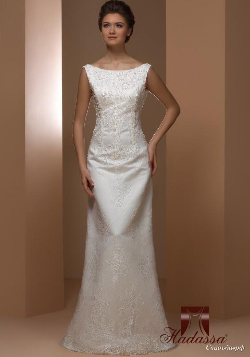 Ювелирный вырез горловины платья и приоткрытая спина, делают всю композицию довольно сдержанной и изысканной, но если смотреть с другой стороны эти, казалось бы, неприметные элементы, придают особой пикантности и очарования невесте. Платье красивое и отлично «сидит» на любом типе фигуры.