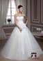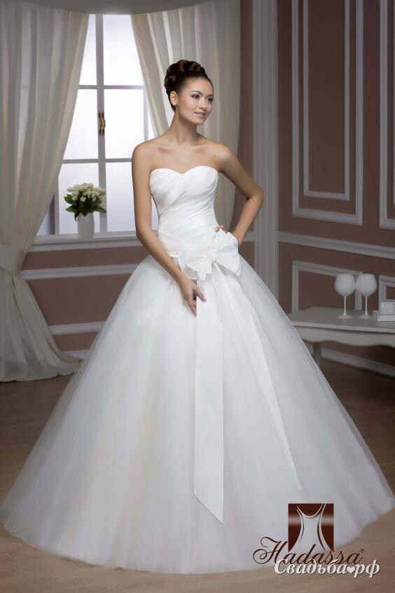 Корсет декорирован вышитыми аппликациями, они придают платью особой нежности. Лиф без бретелек, это позволяет сделать акцент на печах. Большой бант на поясе дополняет платье. Пышная юбка добавляет образу некой легкости.