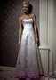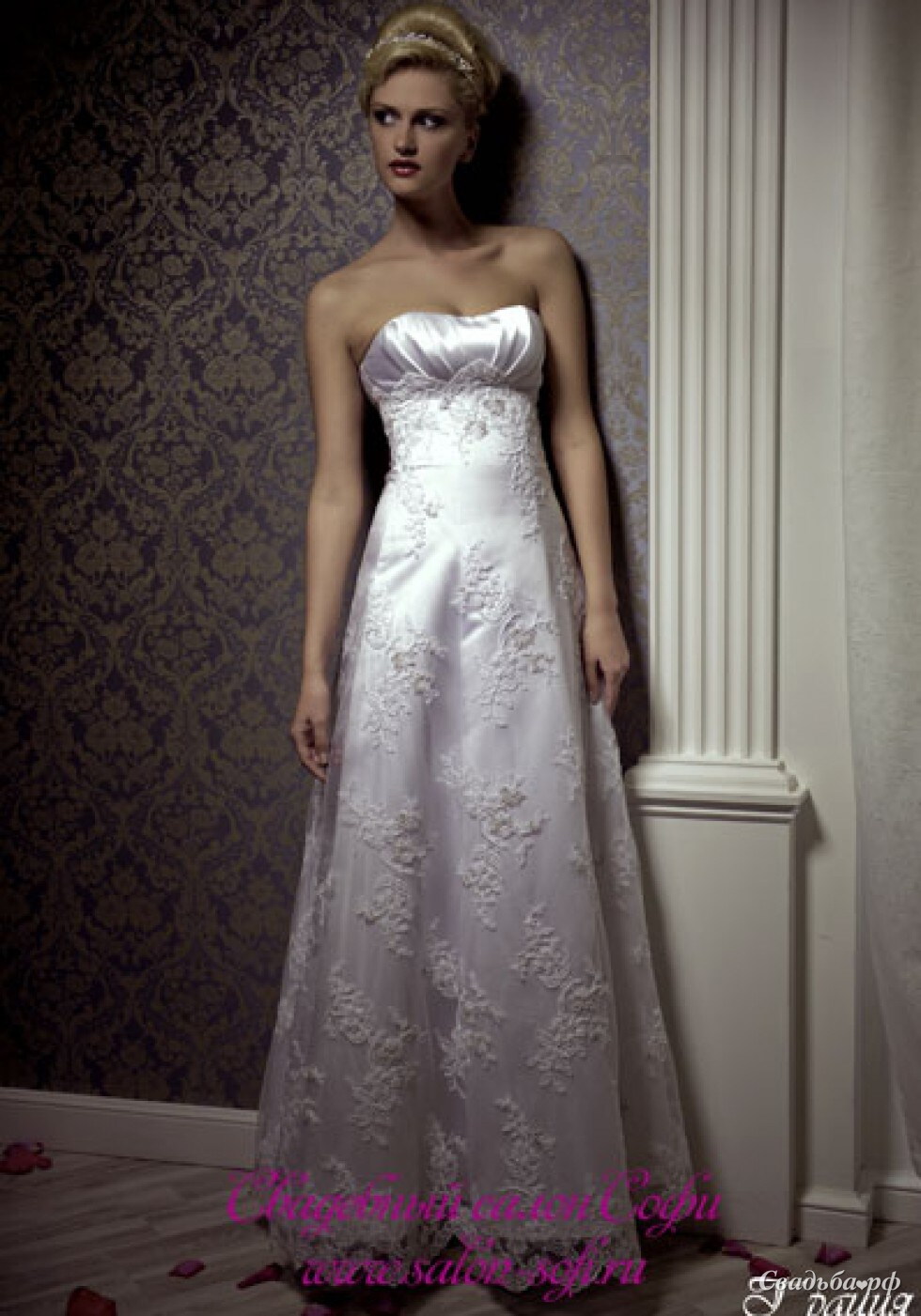 Атласное свадебное платье декорировано кружевными вставками. Корсет с открытой зоной декольте и объёмной драпировкой на груди привлекает внимание к бюсту. Длинная юбка постепенно расширяется к полу. Наряд может похвастаться элегантностью и лаконичностью форм. Платье идеально садится по фигуре и подчёркивает женственность силуэта.