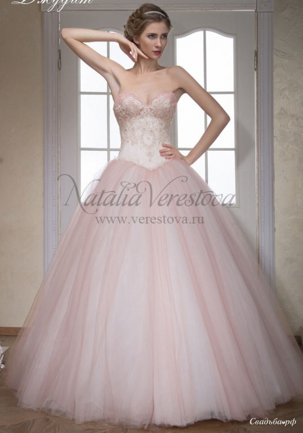 Прекрасное свадебное платье от известного дизайнера Н. Верестовой. Сочетание белого и розового фатина на пышной юбке придают этому платье необыкновенную воздушность и особенную нежность. Это платье создано для тех невест, которые готовы к экспериментам. Оно способно подчеркнуть не столько все прелести фигуры своей обладательницы, но отразить ее характер. Не бойтесь проявить свою индивидуальность!