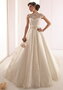 Великолепное свадебное платье А-силуэта дополнено огромным шлейфом. Роскошное сочетание атласа и кордового кружев сделает Ваш образ поистине королевским! Ажурная вставка на груди и прикрытые плечики делают этот наряд уместным для венчания. Талия подчёркнута широким поясом со сверкающей вышивкой. Пышная юбка придаёт образу изысканность.