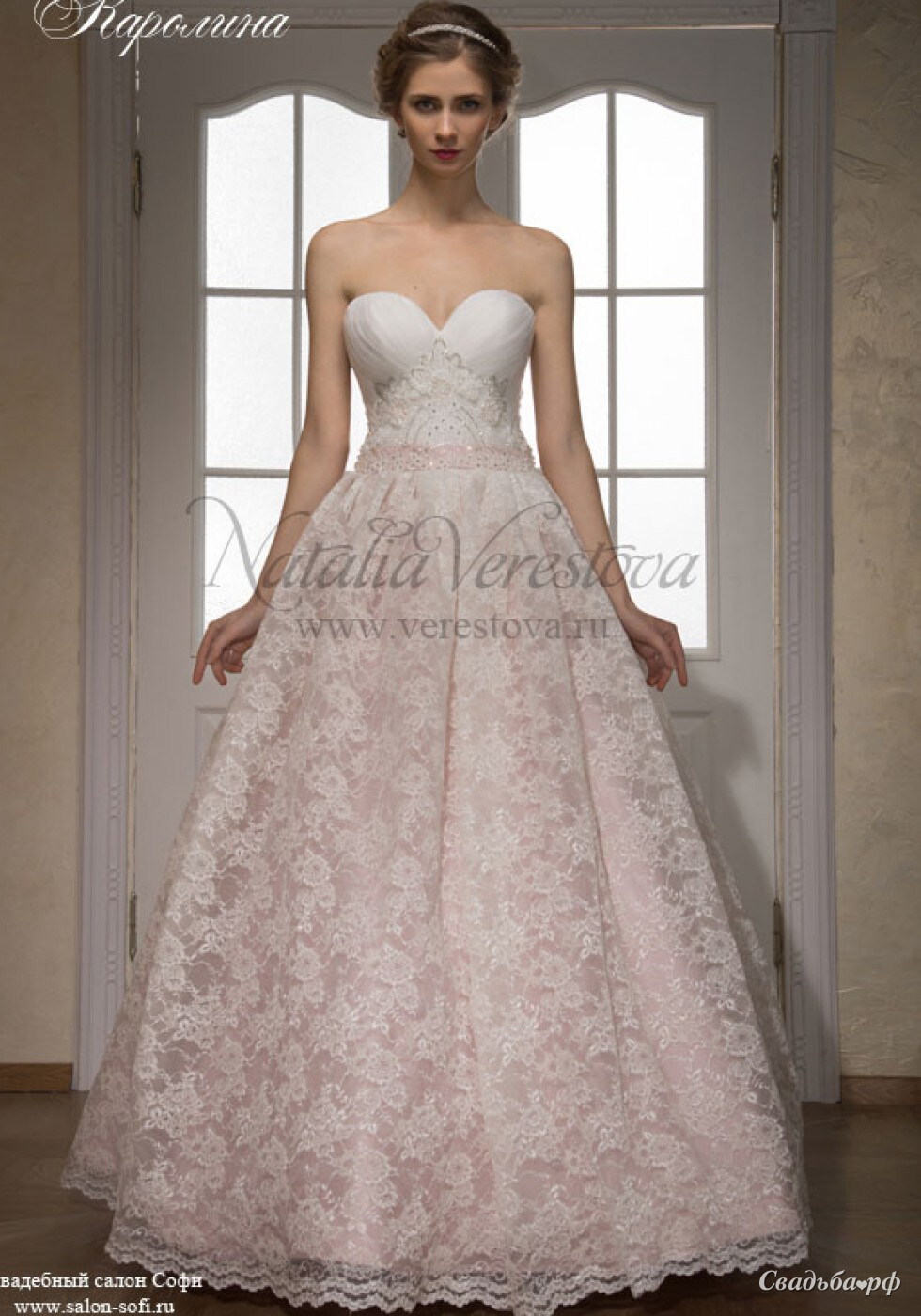 Нежное свадебное платье от дизайнера Н.Верестовой отличается оригинальным кроем и безупречными формами. Изящный корсет с открытой зоной декольте и эффектно выделенной грудью идеально садится по фигуре и выгодно расставляет акценты. Талия украшена сверкающими пайетками и бисером. Пышная юбка со складками расшита кружевом.