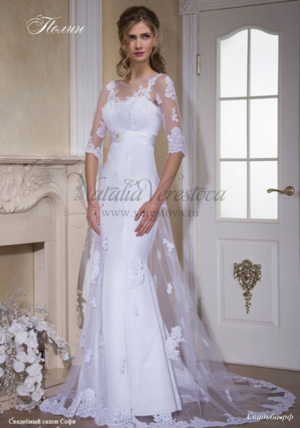 Очень необычное свадебное платье силуэта «русалочка» от известного дизайнера свадебной моды Натальи Верестовой. Вышитые нежным кружевом рукава 3/4, атласный пояс, эффектно подчеркивающий линию талии невесты, "чехол" из кружева, полностью покрывающий наряд - все это делает платье изысканно утонченным и говорит об исключительном вкусе его обладательницы.