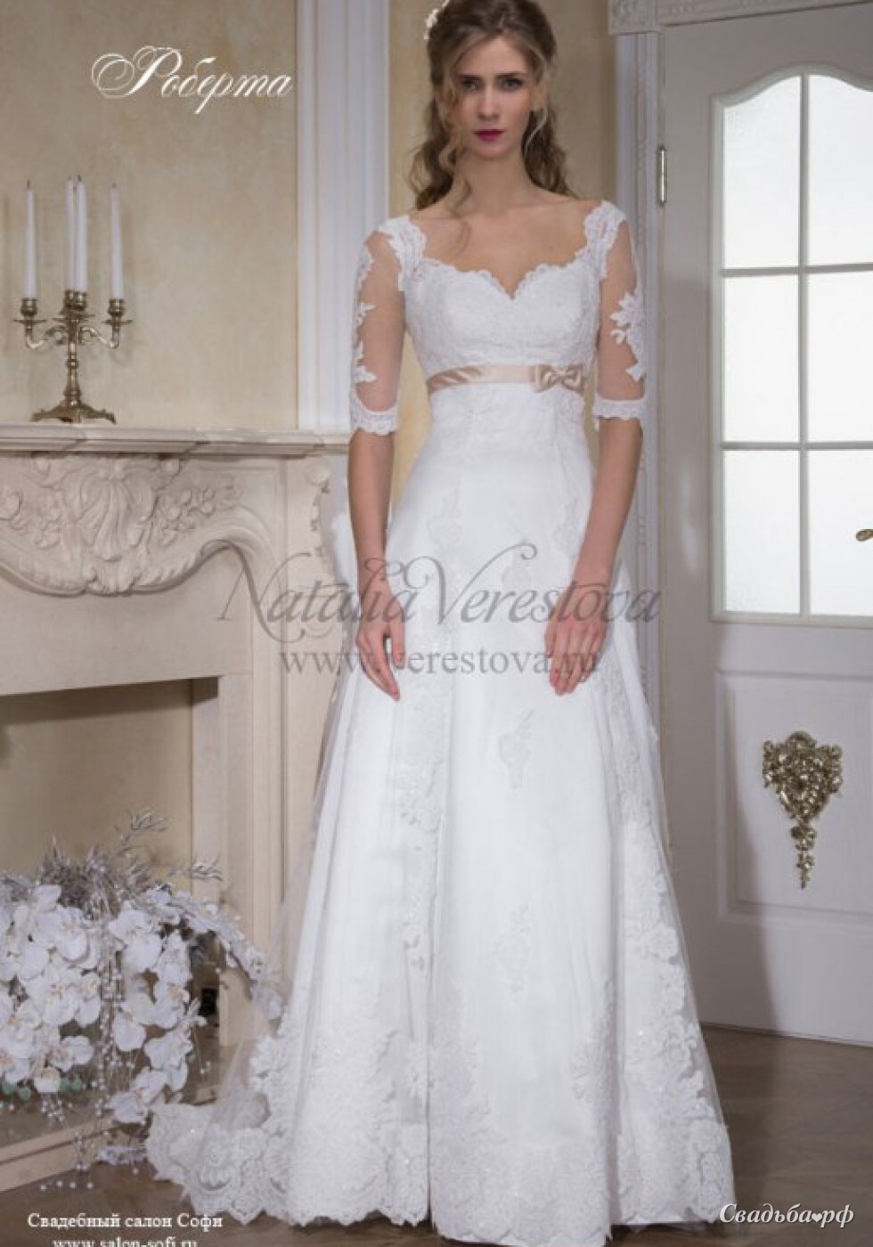 Нежное изысканное кружевное свадебное платье А-силуэта от известного дизайнера свадебной моды Натальи Верестовой. Прекрасно подойдет как для гражданской церемонии, так и для венчания в церкви. Особую изюминку наряду придают укороченные прозрачные рукава, расшитые кружевом и атласный пояс контрастного цвета, который акцентирует внимание на линии талии.