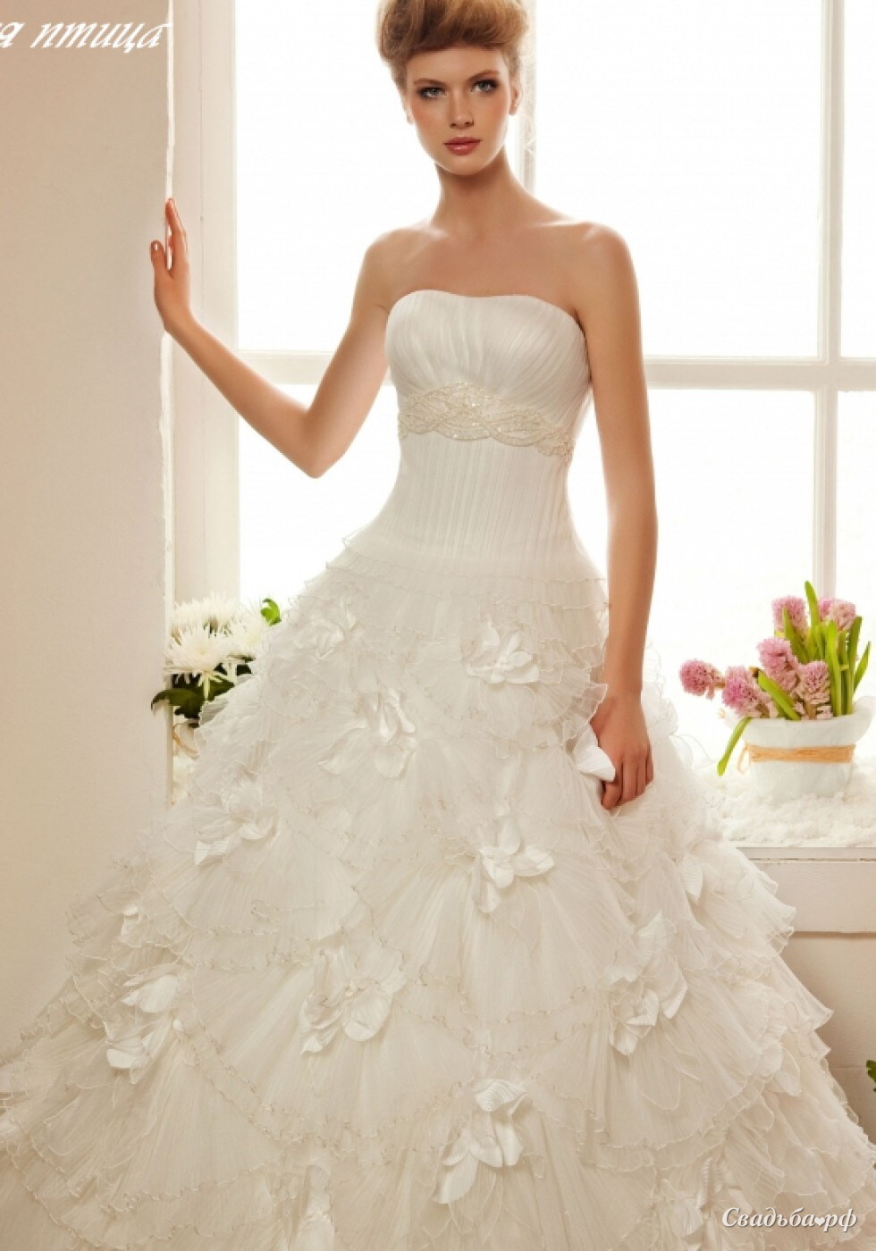 Романтичное свадебное платье, в названии которого сказано всё - Райская Птица! Соблазнительный корсет с плиссированной драпировкой и необычным плетёным декором под грудью акцентирует внимание на достоинствах Вашей фигуры. Пышная юбочка с оригинальными воланами и цветами придаёт образу воздушность и весеннюю свежесть.