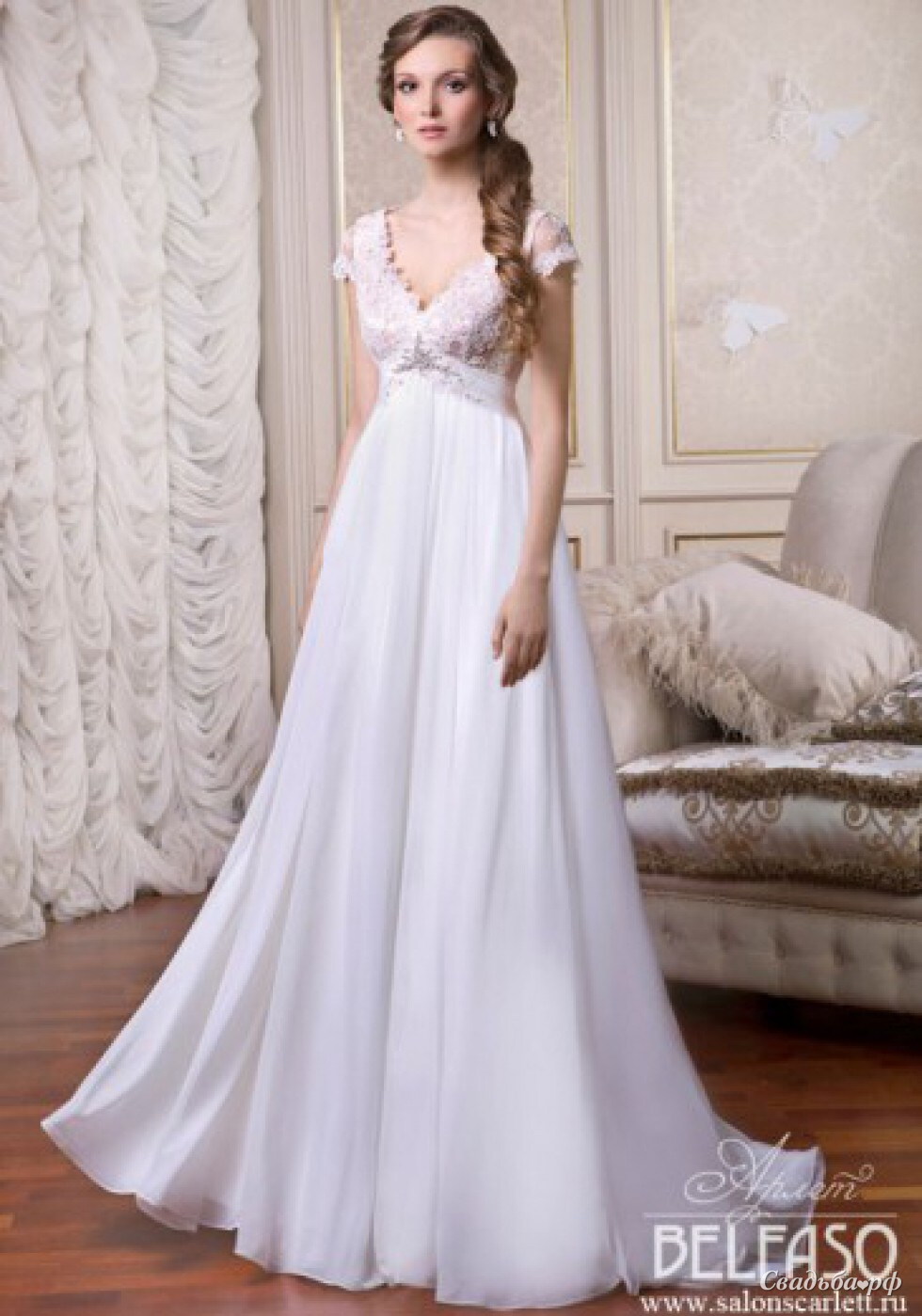 Шифоновое платье от именитого бренда Belfaso отличается элегантностью и нежностью. Лиф и широкие бретели украшены кружевом. Плечики закрыты. Завышенная талия подчёркнута атласным поясом, расположенным под углом и дополненным вышивкой. Длинная юбка свободного кроя зрительно вытягивает силуэт и придаёт образу весеннюю лёгкость и свежесть.
