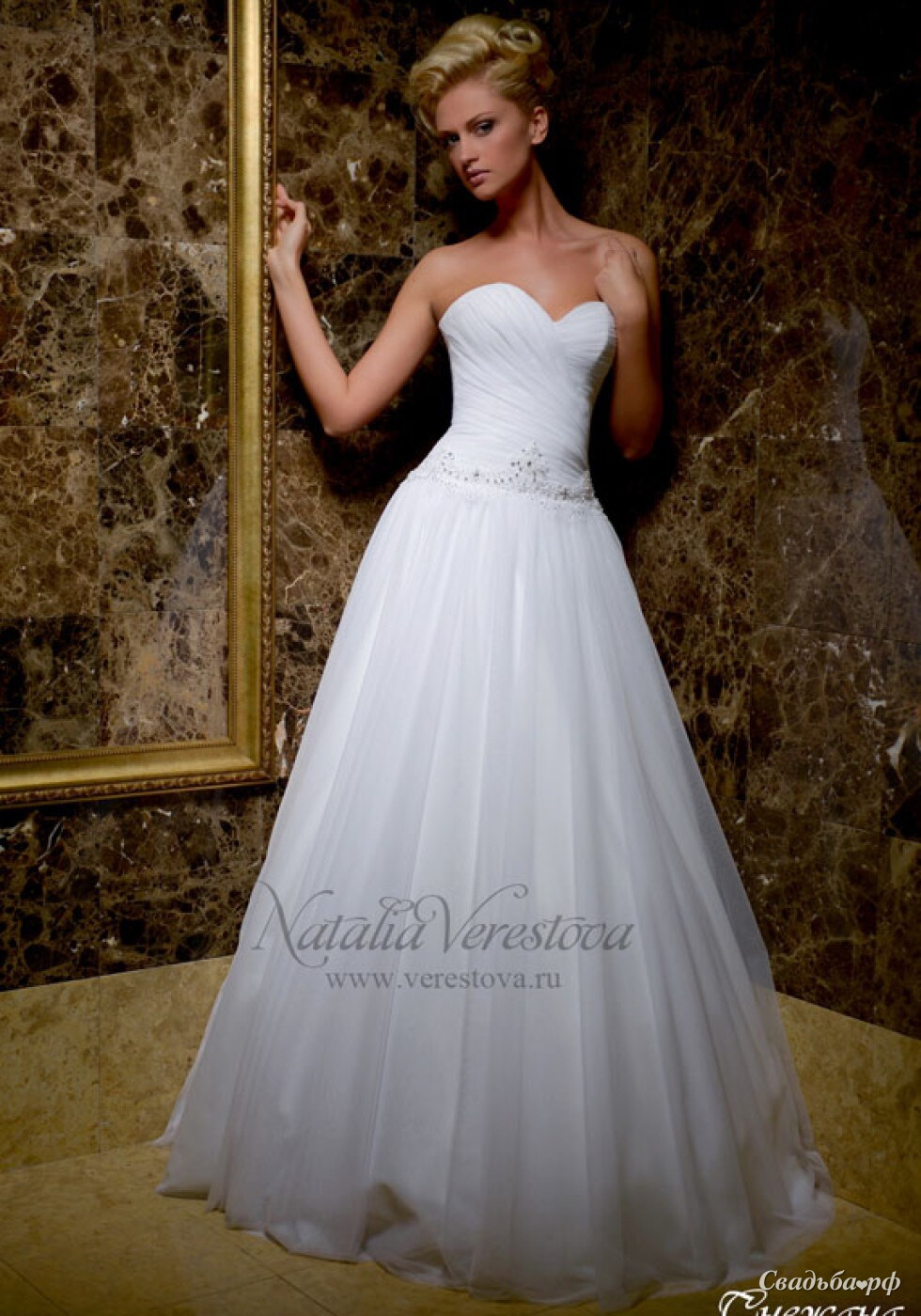 Эффектное фатиновое платье А-силуэта понравится истинной леди. Наряд не перегружен декором и отличается безупречностью форм. Драпированный корсет с оголённой зоной декольте идеально садится по фигуре и подчёркивает её достоинства. Пышная юбка с лёгкими складками струится до самого пола. Широкий пояс декорирован стразами.