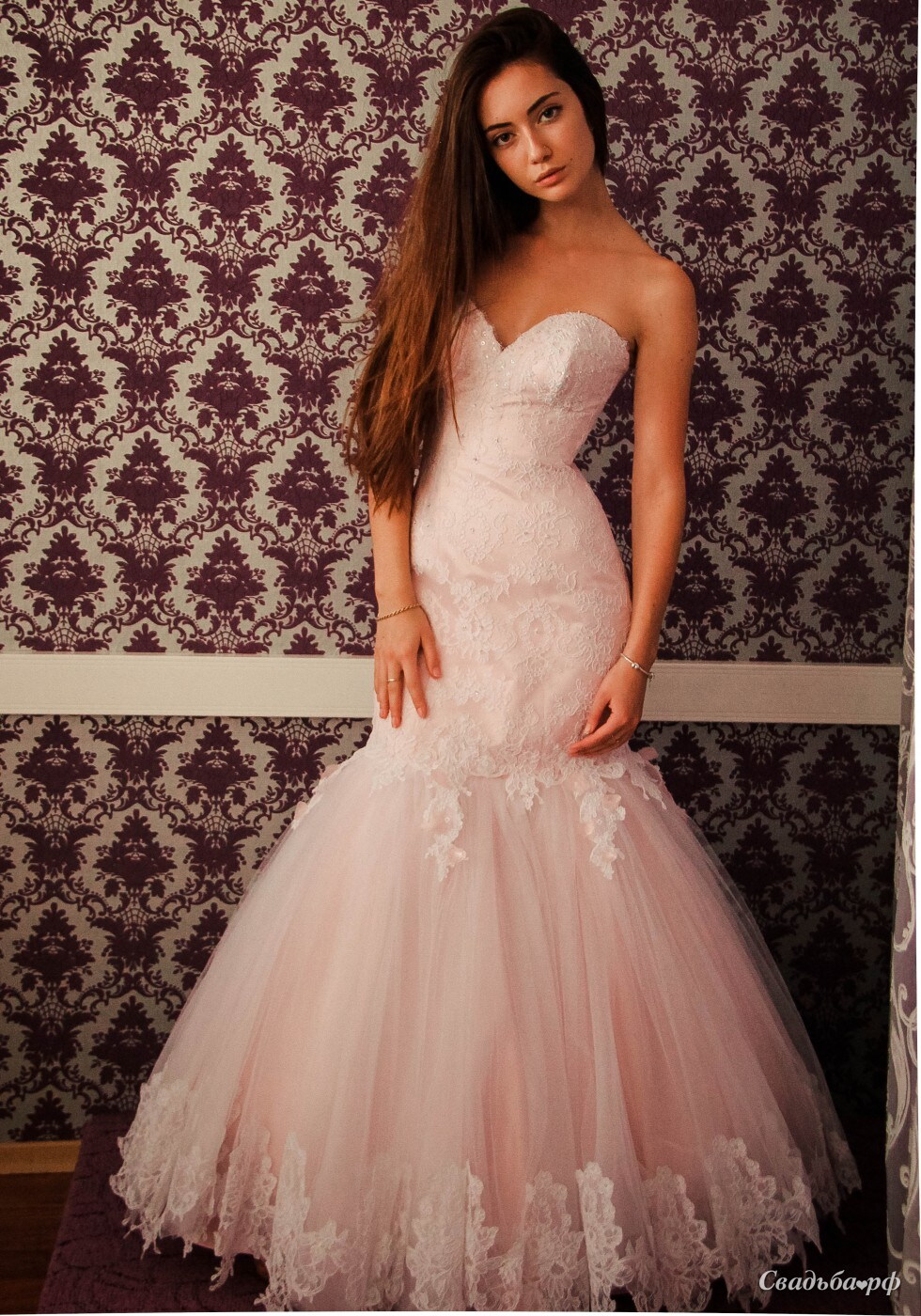 Элегантное свадебное платье силуэта рыбка идеально садится по фигуре и подчёркивает все женственные изгибы. Заниженный корсет вручную расшит кружевом. Пышную фатиновую юбку снизу и на границе с облегающей части обрамляют кружева. Пикантно оголённая зона декольте приковывает к себе все взгляды. В таком розовом наряде Вы будете неотразимы.