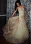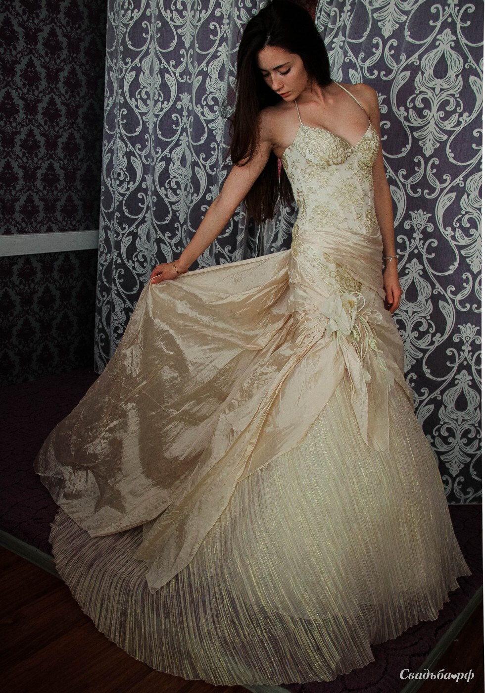 Королевское свадебное платье золотого цвета выполнено в стиле рыбка. Сочетание различных тканей и драпировки сделают Ваш образ неповторимым! Вручную расшитый корсет с открытой зоной декольте и тонкими бретелями подчёркивает бюст и талию. На бедре разместился искусный цветок ручной работы. Наряд дополнен небольшим шлейфом.