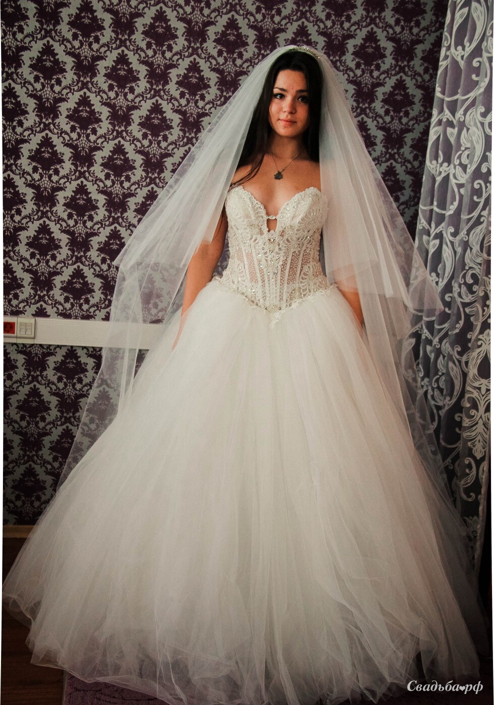 Роскошное свадебное платье с полупрозрачным корсетом, расшитым стразами и пайетками, привлекает внимание к бюсту. Этот королевский наряд создан для самых смелых и дерзких красавиц. Пышная юбка с множеством слоёв нежнейшей ткани напоминает лёгкое облако и придаёт образу торжественность. Почувствуйте себя настоящей принцессой.