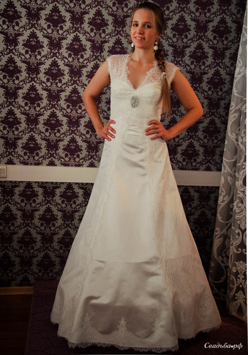 Сдержанность и скромность отличает это свадебное платье. Кружевная маечка и брошь на груди придают этому наряду особую элегантность. Длинна юбка из клиньев постепенно расширяется к полу. Подол украшен сверкающей вышивкой и кружевными вставками. Представленное свадебное платье привлекает внимание к бюсту и эффектно облегает талию.