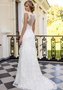 Романтичный свадебный наряд из новой коллекции 2015 года понравится самым романтичным и женственным натурам. Весь наряд покрыт нежным кружевом. V-образный вырез на груди обрамлён широкими бретелями. Спинка закрыта полупрозрачной вставкой с рядом пуговиц. Длинная юбка облегает бёдра и чуть расширяется к полу. Шлейф дополняет образ.