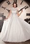 Блеск декора на воротничке-стойке и атласном поясе, и фактурная отделка кордом на корсете этого платья смягчены актуальным решением для юбки, выполненной из нежного кружева и дымчатого фатина. Гармонизируют образ крупные цветочные аппликации с крупными стразами на юбке.