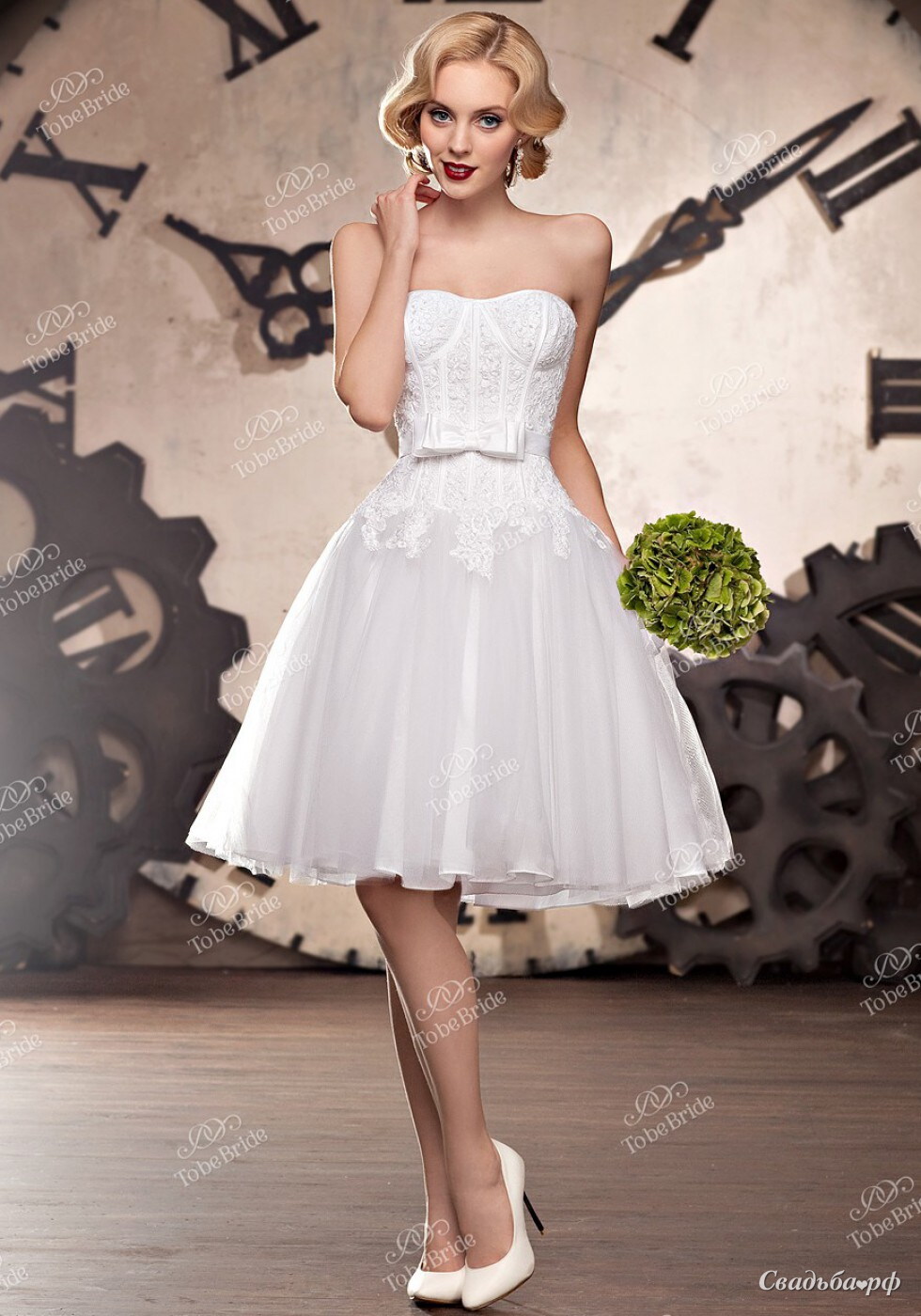 Смелая длина, плотный корсет из кордового кружева, воздушная юбка и элегантный бантик на талии: можете не сомневаться – сердца гостей точно будут покорены!