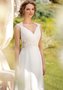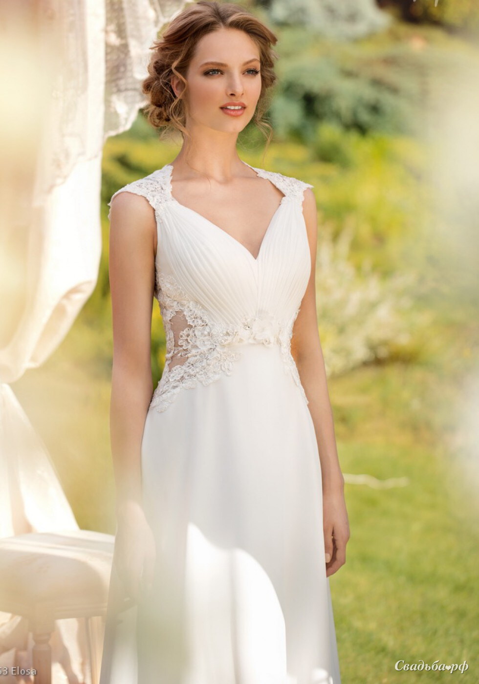 Изысканное силуэтное платье, эффектно демонстрирующее силуэт и грацию девушки. Традиционное сочетание шифона и кружева создали эффект сложности и тонкости. Модель с плотным лифом спереди, густо задрапированным шифоном и полупрозрачной спинкой сменяется спокойной шифоновой юбкой. Плавные линии подреза отделаны кружевными элементами. Нежная и хрупкая брошь ручной работы оттеняет фактуру кружева и как нельзя лучше украшает платье.