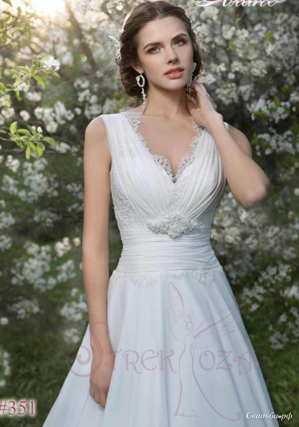 Элегантное платье А-силуэта идеально подчеркивает все достоинства фигуры, нежнейшая лямка идеально подчеркивает форму груди. Драпировки по талии придают формам изысканность и утонченность. Модель идеально подойдет для венчания в церкви, благодаря нежнейшему шифону, который вуалирует более плотный атлас. Безупречность модели создают укороченный корсет и плавная линия бедра.