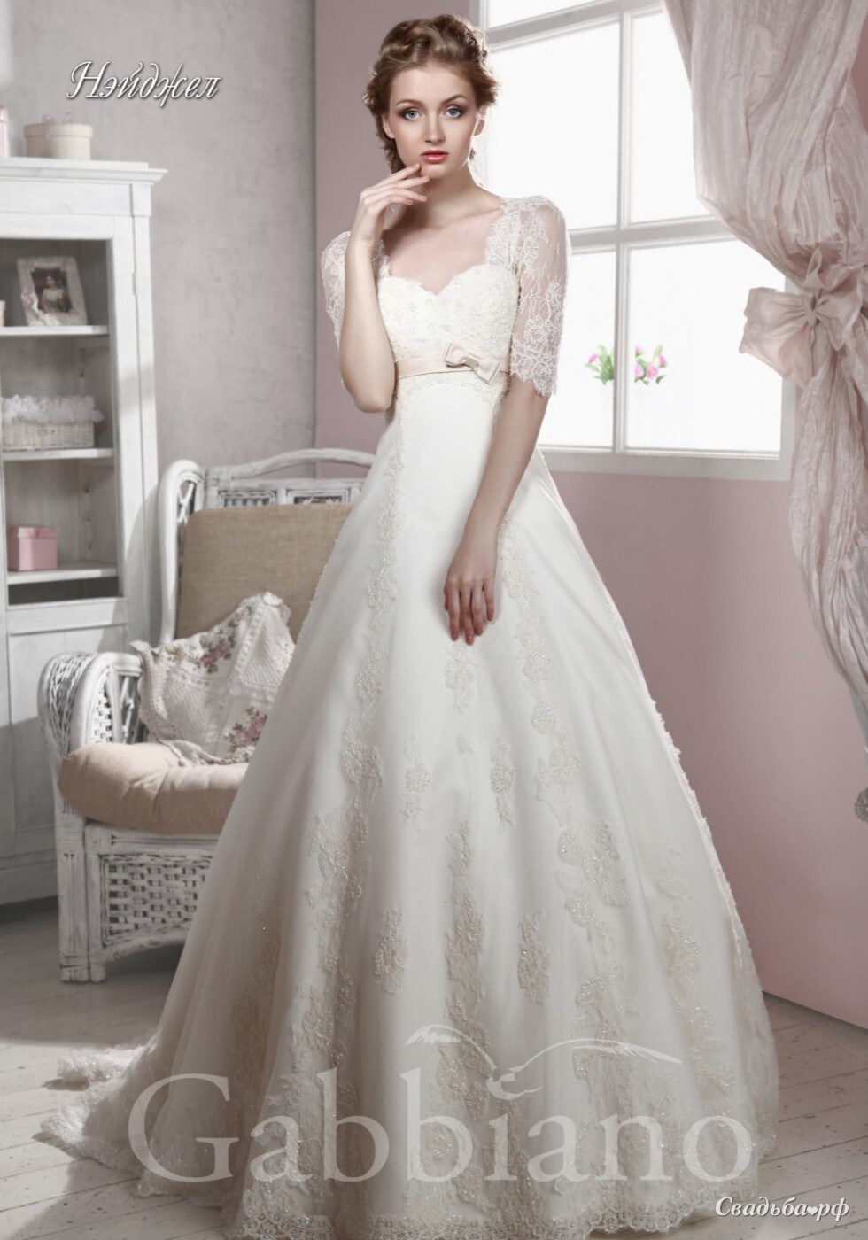 Элегантное свадебное платье А-силуэта, с эффектом завышенной талии. Закрытая спина и рукав до локтя являются прекрасным дополнением к свадебному образу предназначенному для венчания в церкви. Завышенная талия, обозначенная цветным пояском, будет идеальна как для девушек в положении, так и для невест нестандартного размера. Изысканность модели придает кружево расшитое стеклярусом и бисером, что делает платье сказочно красивым.