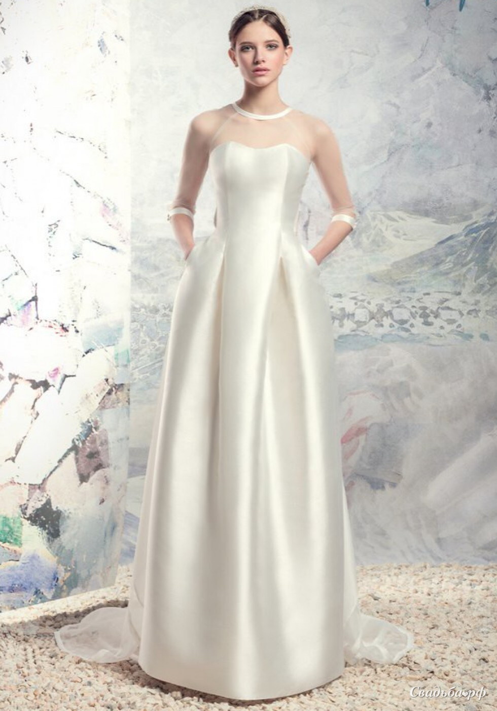 Платье-тюльпан выполнено из атласа с длинным рукавом.