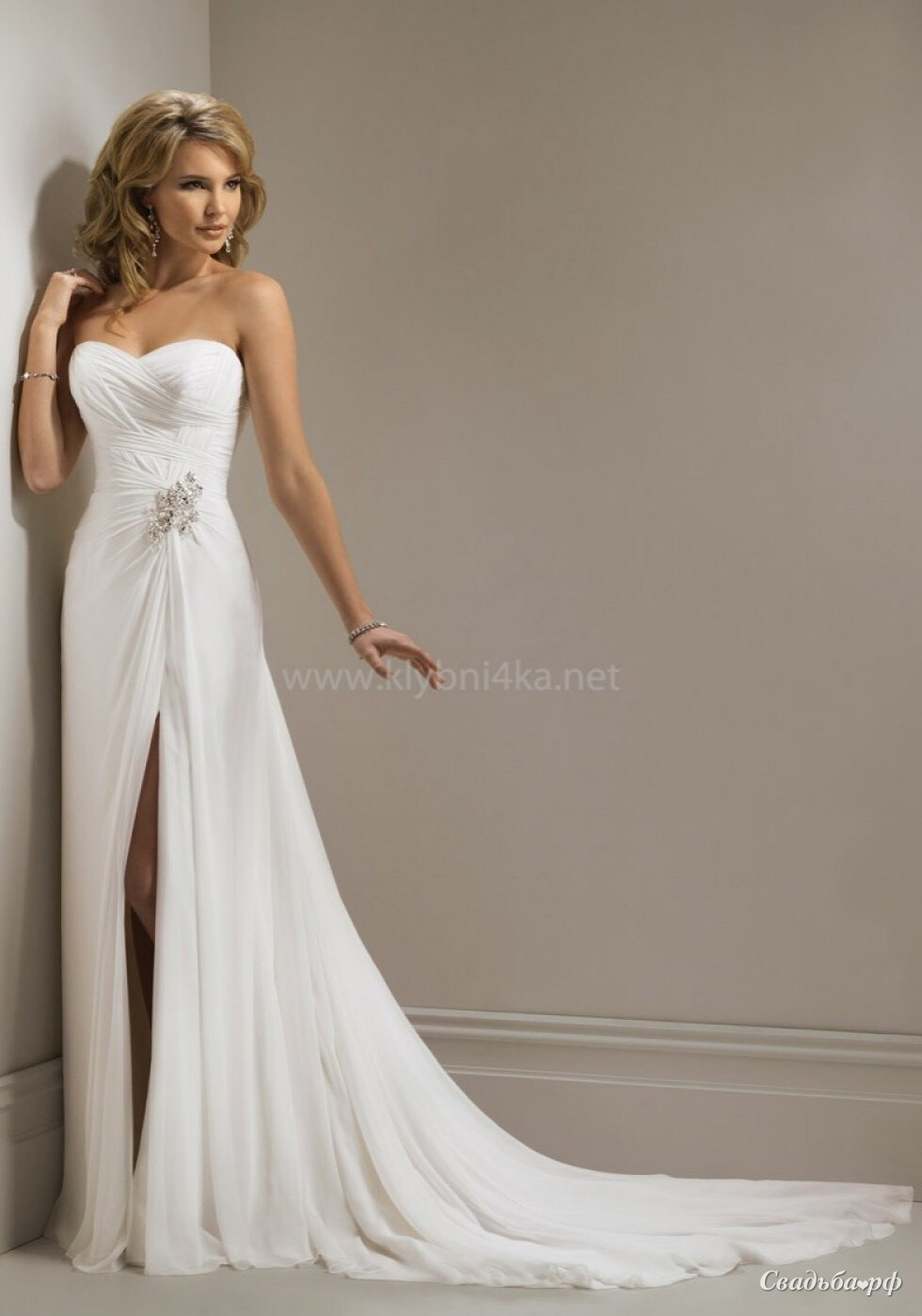 Свадебное платье прямого силуэта с шифоновой струящейся юбкой и с шикарным выходом на шлейф.