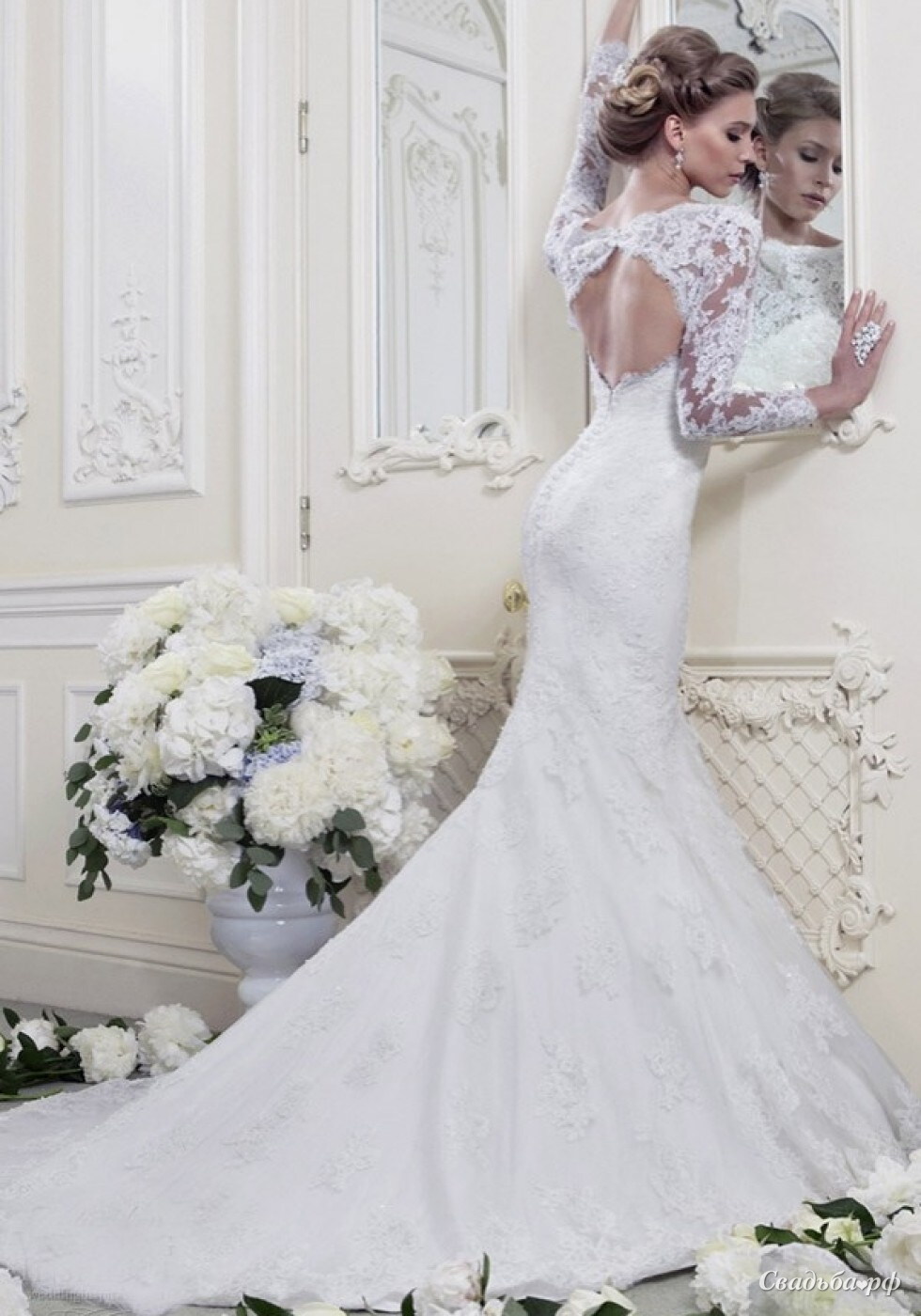Свадебное платье стиле рыбка. Шикарный кружевной шлейф и открытая спина. Стильный образ невесты.