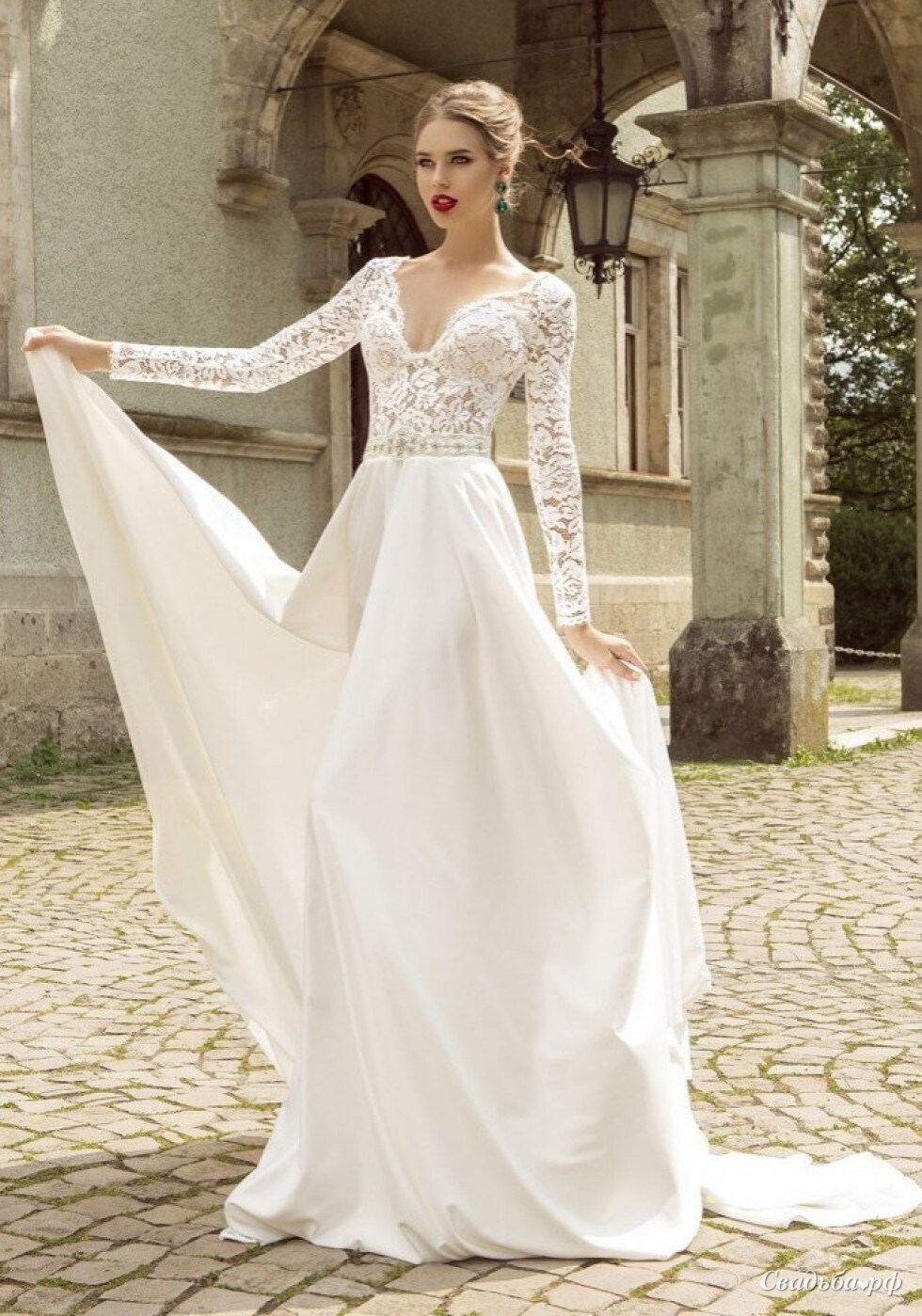 свадебное платье прямого силуэта, кружевной верх с длинным рукавом и лёгкой юбкой создадут романтичный образ любой девушке.