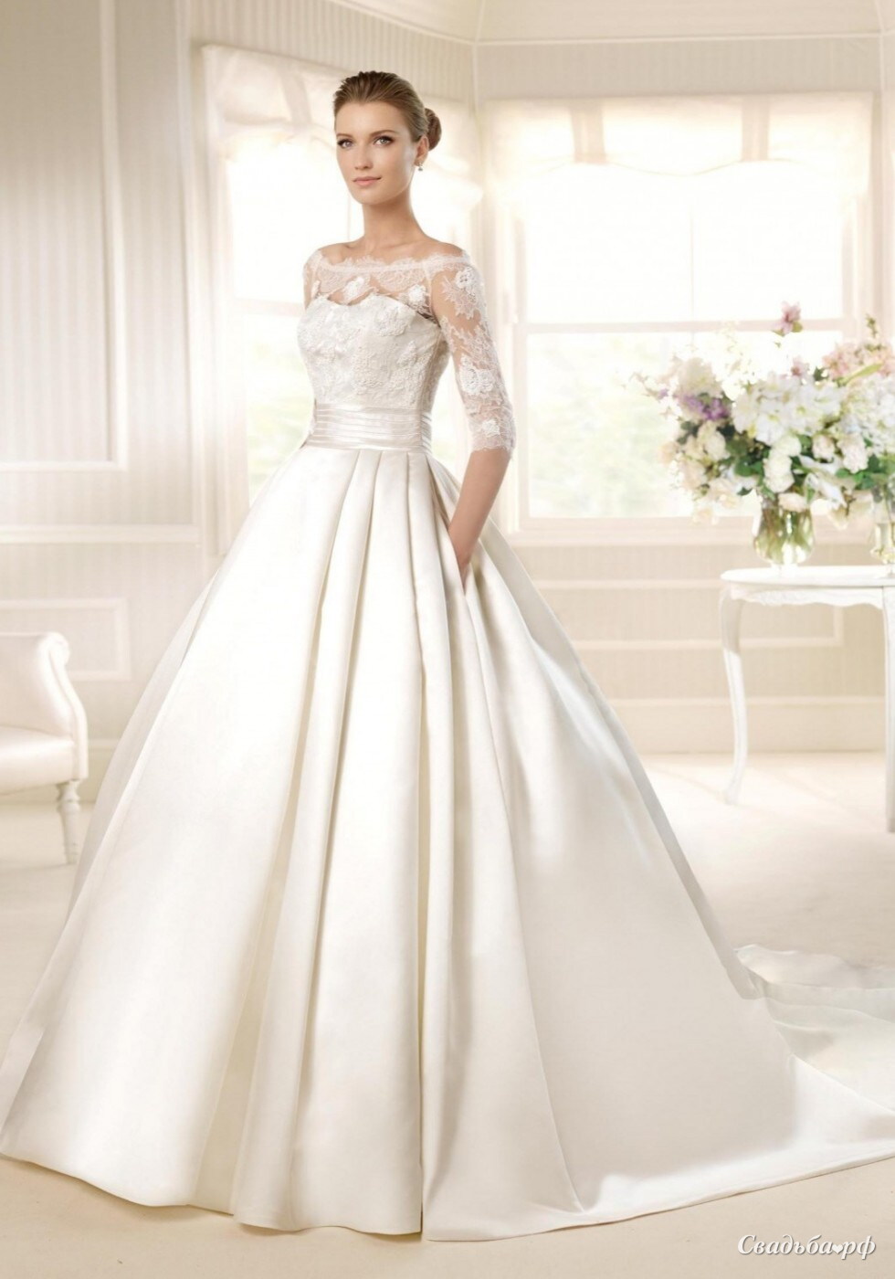 Свадебное платье А-силуэт с атласной юбкой и кружевным верхом с рукавом.