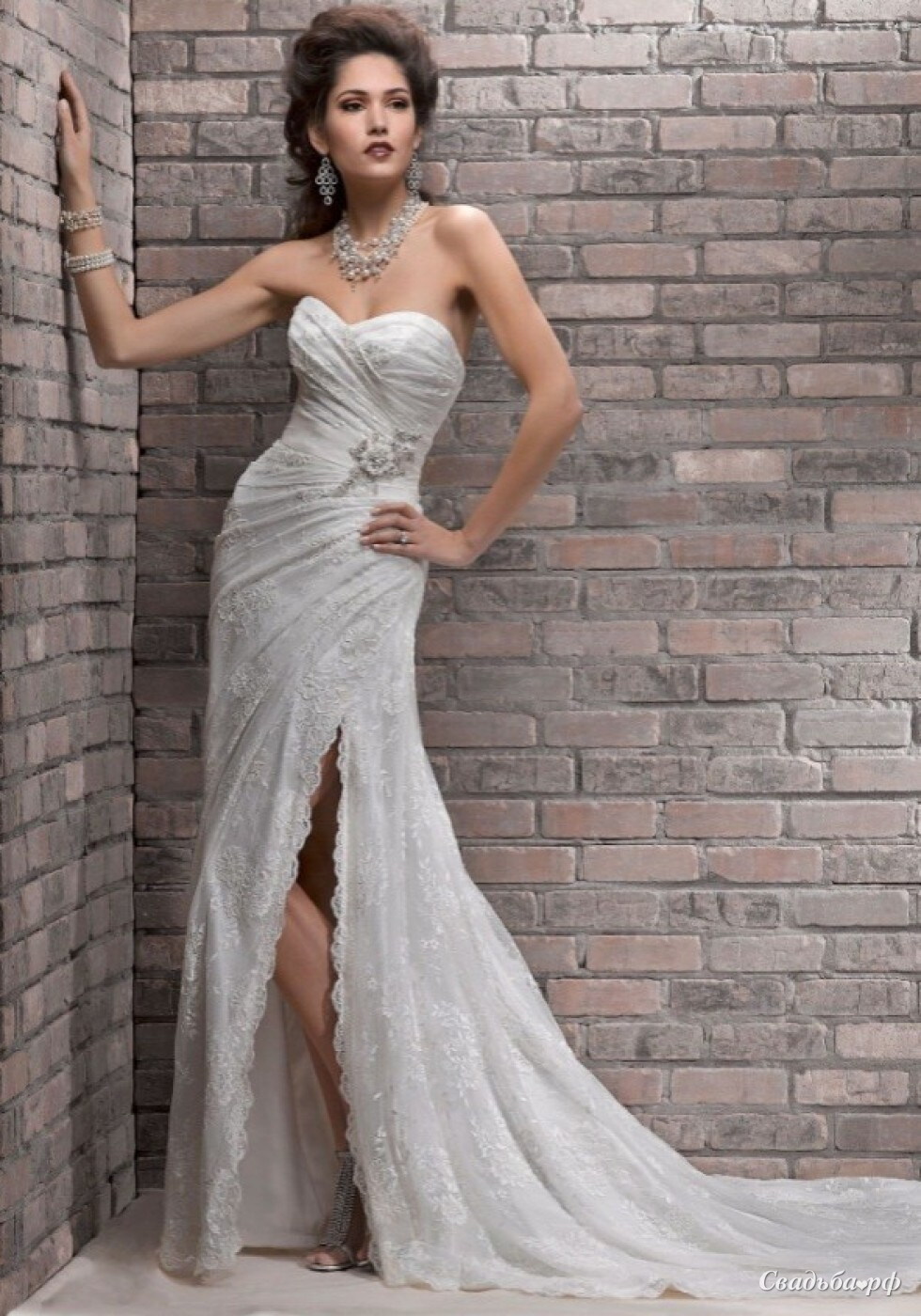 Свадебное платье прямого силуэта с разрезом и длинным шлейфом.