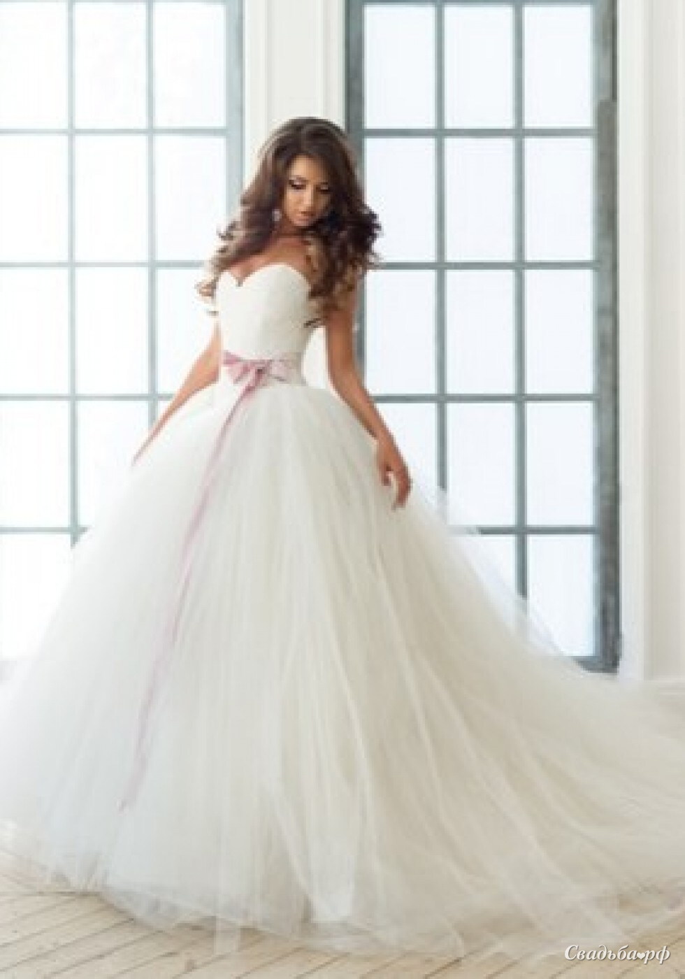 Свадебное платье с пышной юбкой и цветным поясом, открытое декольте.