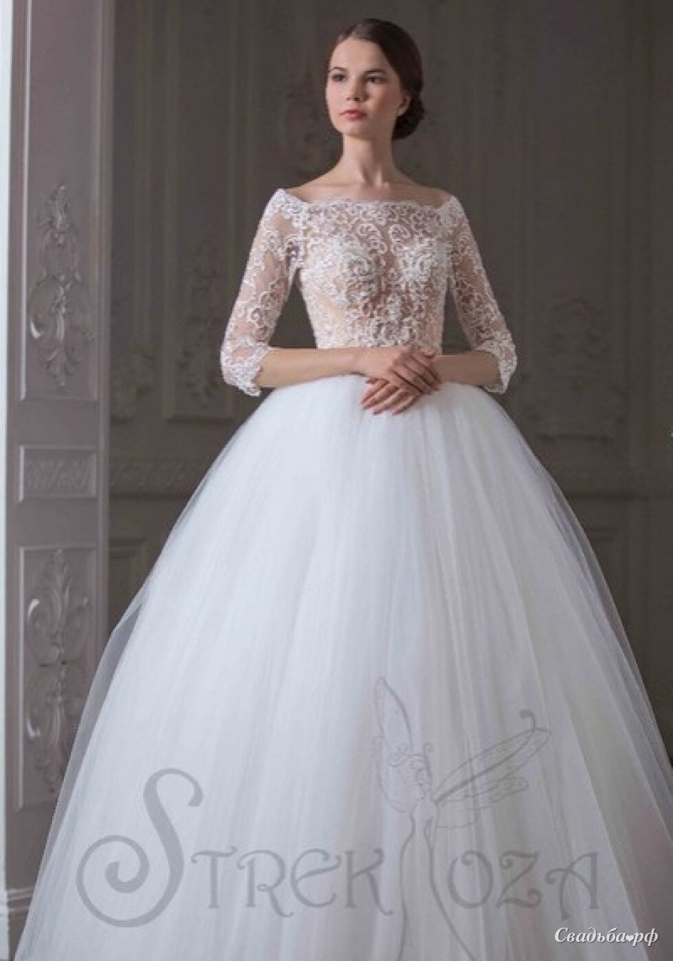 Свадебное платье с пышной юбкой, кружевной верх расшит бисером.