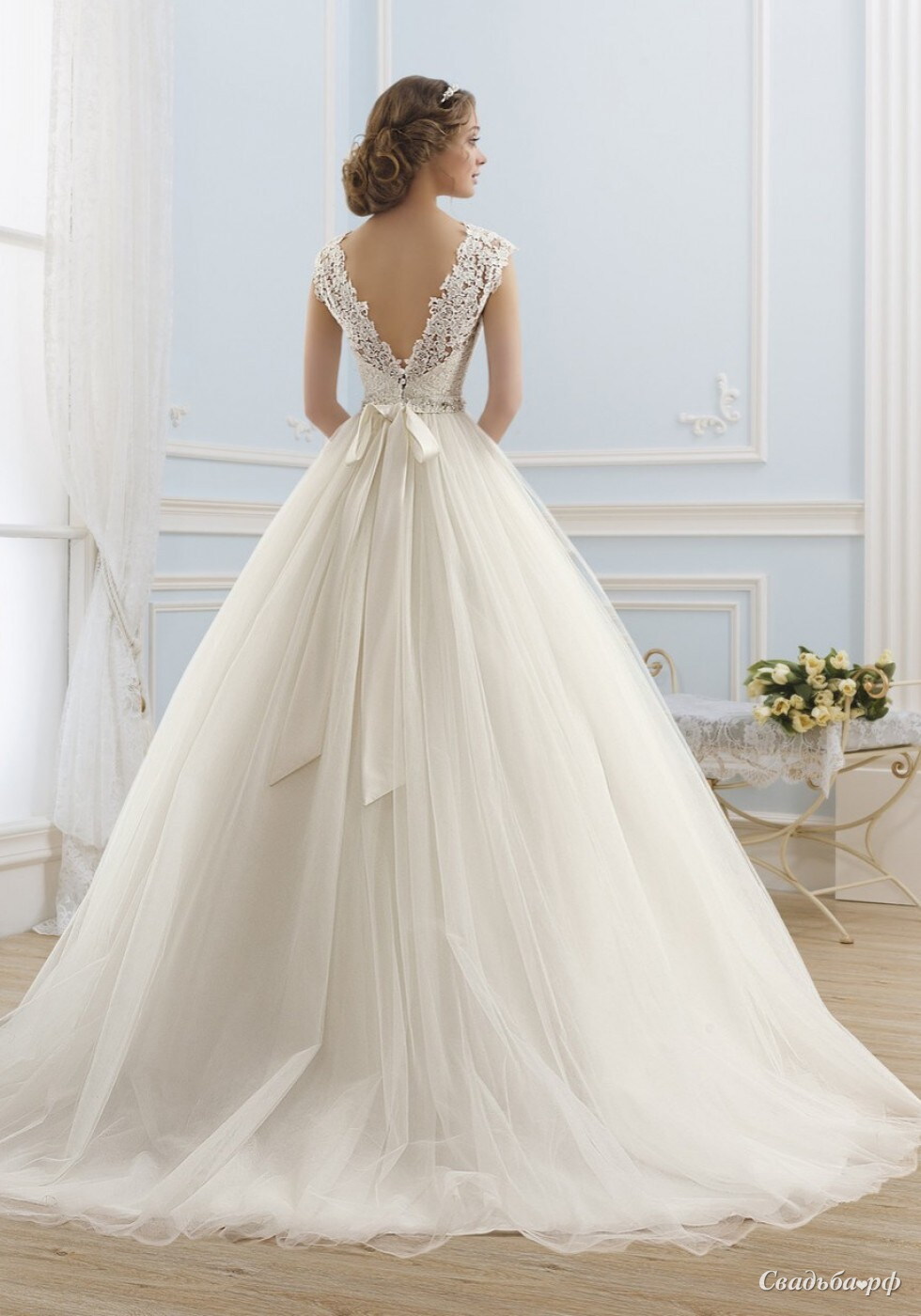 Свадебное платье с пышной юбкой с длинным шлейфом и открытой спиной.